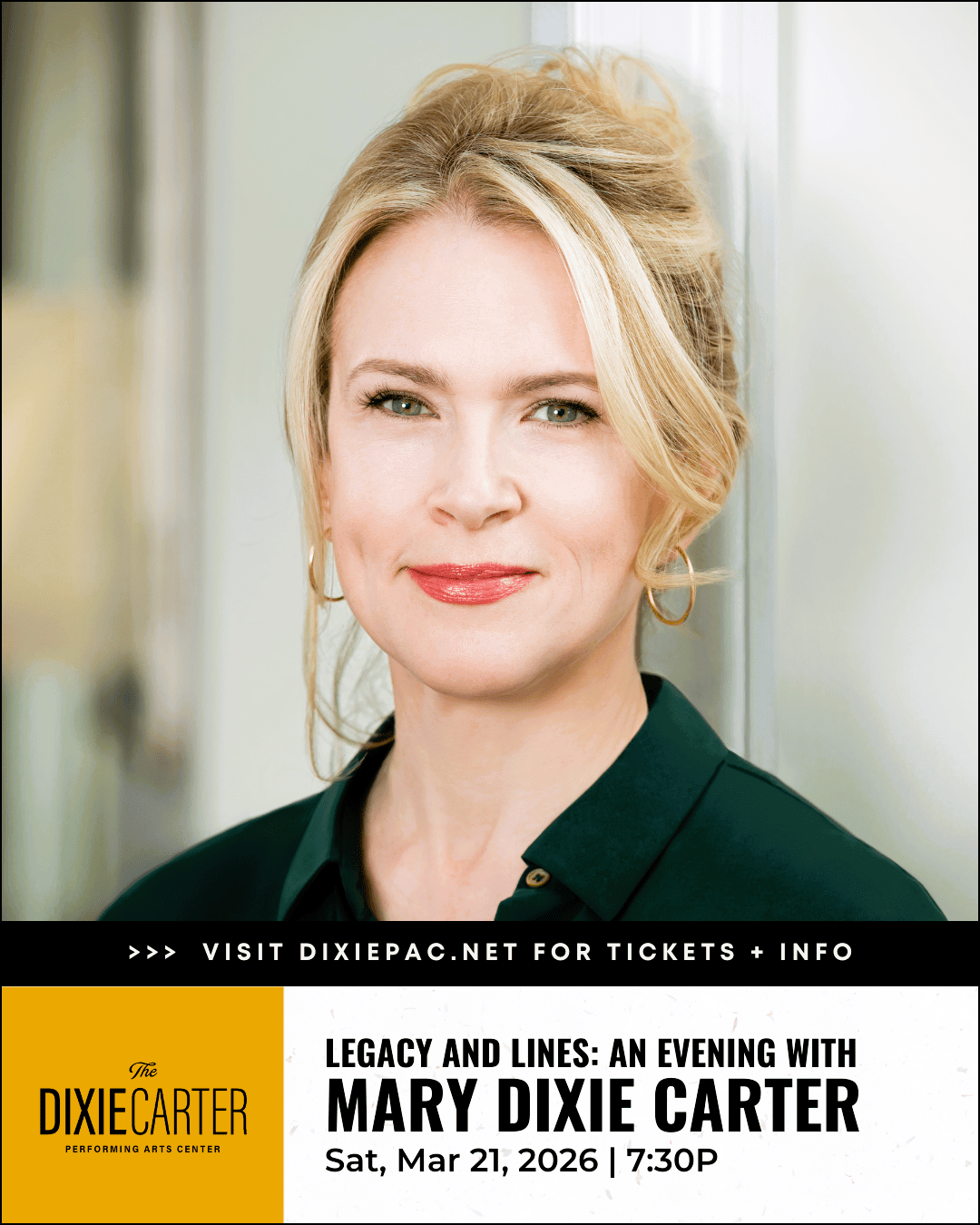 This event is presented by FirstBank. Tickets include both the market experience and evening event with Mary Dixie Carter and are priced at $25 + tax for VIP and $15 + tax for General Admission. For more information and market vendor applications, visit DixiePAC.net.